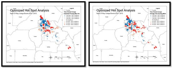 Based on Level 3 of the spatial analysis framework, we generated two supplementary map layers (Figure 16) using the Optimized Hot Spot Analysis tool by selecting Right Of Way (trees related) outage events in the input feature and consecutively selecting “expected pruning staff hours,” “average standard tree pruning miles with bucket,” and “actual pruning staff hours/circuit mileage” for the analysis field.