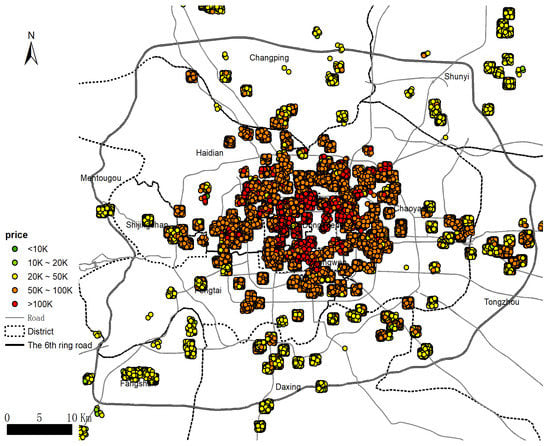 In this section, we give a brief introduction to the study area of the paper and a graphic overview of the sample statistics. As the capital of China, Beijing is enclosed by rings of roading. The officially declared CBD is the center, lying between the south-east 2nd and 3rd ring roads. In addition to CBD, there are multiple commercial centers in Beijing with extremely high-density populations, such as the Zhongguan Village in Haidian district, which is also known as the “Silicon Valley” of China, and contains the most well-known Chinese universities, Peking University and Tsinghua University. There are several satellite centers lying around the suburb or exurb of Beijing, such as the Tongzhou new city at the southeast corner of the old urban core. The other important socioeconomic features of Beijing (up to the end of 2016) are summarized in Table 1 [60]. Because in this study, Beijing is only taken as an example to demonstrate the analytic power of the proposed Makarov model and constrained clustering method, it would be misleading to present too many details on the background of the city; interested readers can find comprehensive introductions to Beijing’s housing market by themselves in the references [61,62].