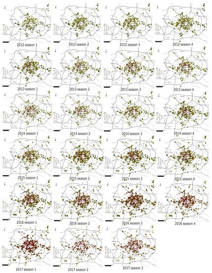 Because the difference of housing prices between two consecutive time periods have to be repeatedly evaluated in order to estimate the Markov transition matrix, specifications of time interval and grid structure are needed for temporal comparison. Three months (or equivalently, a quarter) was used as the time window of comparison. This is because an appropriate interval length has to be long enough that it admits a dense coverage of transaction records on map, while it should not be long enough to loose important information regarding market change. The transaction frequency in our raw data was a day, but a preliminary analysis showed that the coverage could not be uniformly dense if interval length was selected to be a day or a week, or even a month. When the time horizon was expanded to a quarter, at least three hundred communities were included for all seasons during the entire data collection period. This amount can guarantee a quite good coverage of the built-up areas of Beijing. We show in Section 3.1 that the geographic ranges covered by samples on the quarterly base do not vary significantly from 2012 to 2017; this observation verifies the robustness of our selection. Finally, the National Bureau of Statistics of China also takes a quarter as the official time window to announce their housing market index, which supports the quarterly specification on time-interval length.