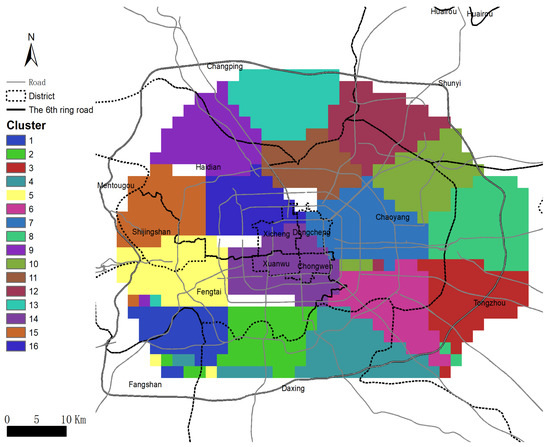 Figure 3 plots the segmentation of the housing market in Beijing, generated on the set of grids and colored according to the cluster membership of every grid. Hotspot analysis was applied to all grids and those “cold-spot” grids where few housing units being transacted were removed nearby. The remaining grids give a sketch of the natural boundary of the entire housing market. It is clear that second-hand housing market in Beijing is agglomerated in the area enclosed by the sixth-ring road, which is also known as a cut-off of urban-suburb and exurb area of Beijing. In addition, the housing market region is not quite symmetric according to the distance between the boundary of the market and sixth-ring road. Comparing to the south and west boundary, the distance between sixth-ring road and the north and east side of boundary of housing market is much smaller; this asymmetricity reflects that the northern and eastern parts of Beijing lead its southern and western parts in terms of economic development and completeness of infrastructures [63].