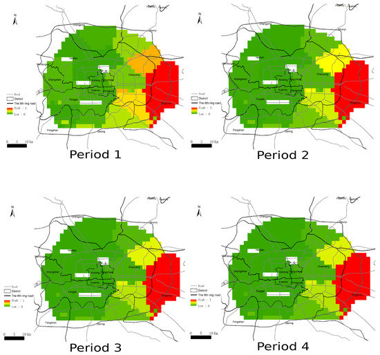 Due to the lack of data, the price (and the other attributes) estimated from (11) may not be accurate on such grids where only a few transactions are recorded within their neighborhood. Thus, it was necessary to remove grids of that type from the price panel. The Getis-Ord statistic [56,57] was calculated and applied to kick out the grids within low-sample-coverage regions.