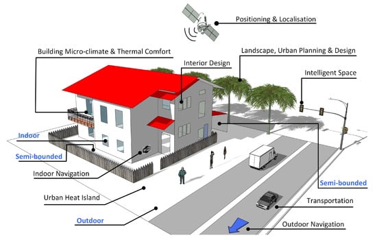 Barriers such as walls, floors, ceilings are commonly used to create or separate indoor cells. Imaginary boundaries can be used to distinguish between space units outdoors for landscape planning. Combination of imaginary and physical boundaries can be used to partition spaces for leisure, drying laundry, growing plants [4], sheltering from the sun and wind [5] and similar activities [6,7,8]. Cells have been introduced in different disciplines related to urban applications (Figure 1, such as positioning and navigation [9,10,11,12,13,14,15,16,17,18,19,20,21] (indoor [22,23,24,25,26,27,28,29], outdoor [30,31,32]), building micro-climate and thermal comfort [4,33,34,35,36,37,38], landscape, urban planning and design [39,40,41,42,43,44], urban heat island [45,46,47], interior design [48,49,50], transportation [51,52,53,54] and intelligent space [55,56,57,58].