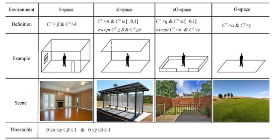 The research presented above is based on examples or human notions to clarify space. Reference [19] made the first attempt to develop a framework for formally distinguishing between spaces, depending on their construction characteristics and methodology to define cells. The authors defined space as “hollow (unoccupied)”, constrained by some partial (or complete) physical boundaries, where human activities can take place. In follow-up research [20,21], the authors introduced three construct elements (Top, Side and Bottom), which allows them to define strict rules for the classification. To quantify the space definitions, the authors proposed three more notions namely Closure, Physical boundary, Virtual boundary. Then spaces can be formally defined using side closure () and top closure (). Three thresholds (, and ) for and two ( and ) for allow to quantify the closure. Applying this mechanism, the authors classified the space for navigation as indoor (completely bounded), outdoor (unbounded) or semi-bounded (side-/top-bounded). Figure 2 illustrates the cases. Note, according to this framework, the courtyard from the above example [68] would be classified as semi-outdoor, because it is side-bounded. Although compatible the concepts still can lead to contradicting classifications if no strict definitions are provided.