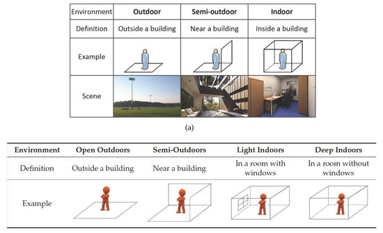 Space classification and definitions by concerning sensor reception. (a) Space classification based on building [15]. (b) Space definition according to the reception of satellites signal [18].