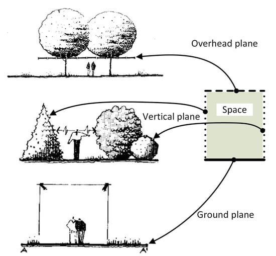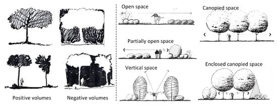 The term of space is also employed in landscape, urban planning and design. Reference [44] defined the vegetation space unit by introducing two concepts: positive (solid) volume and negative (void) volume. From the view of landscape space generation, the space can be defined with the analogy to the building spaces. All plant materials are positive volumes that can be likened to architectural elements such as buildings or wall, while void spaces are enclosed or semi-enclosed volumes enclosed or surrounded by plant materials (left figure of Figure 4). On another hierarchical landscape cell, Reference [39] showed landscape spaces are created (enclosed) by the surrounding vegetations (e.g., trees, bushes) and named the space as “exterior room". Similar to the space in building environment, vegetation are architecturally used as structural materials (e.g., floors, ceilings, walls). Based on the type of enclosure, five types of spaces are formed: open, partially open, vertical, canopied and enclosed canopied (right figure of Figure 4).