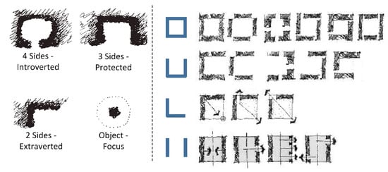 The boundary enclosure gives the space a sense of domain. A landscape space is considered a unit if it is possible to delimit borders [41]. Enclosure patterns are used to express features of the unit vertical boundary, on the view of vertical boundary enclosure degree [88], the number of sides enclosed [90] and enclosure morphology [89]. The aggregation, partition and separation of the vertical boundary composition material create an open-closed boundary, which makes external space enclosure not as completely as indoor environment enclosed by building components, such as walls and roofs [20]. Thus, another two classifications of spaces are proposed based on the boundary status and inner status of the space, including the number of sides [88] and patterns [89]. In particular, Reference [88] used the degree of enclosure to classify space that is the length of the perimeter enclosed by vertical boundaries. Then concluded that different degrees of enclosure result in spaces that vary in character from introverted to extraverted and four types of spaces are raised: four sides-introverted (360 degree), three sides-protected (270 degree), two sides-extraverted (90 degree) and object-focus (0 degree), see the left figure of Figure 5. Reference [89] classified the spaces into four types by insulting space enclosure patterns (□, ⊔, L and ‖) formed by vertical boundaries (right figure of Figure 5). Indeed, the aggregation, partition and separation of the vertical boundary composition material create an open-closed boundary. The discontinuous feature of landscape boundary makes the enclosure different from architecture spaces. From partly enclosed to fully enclosed, all enclosure types represent for a certain existing status of landscape space.