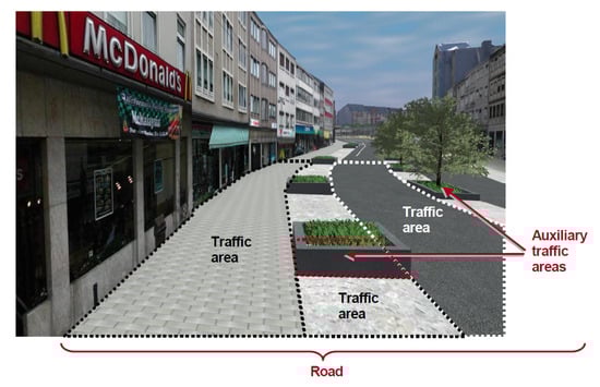 Road space is a general name of all spaces used for transporting. In addition to the engineering names (traffic and auxiliary traffic) mentioned above, it is further planned/subdivided based on diverse transportation options, typically including walking, cycling, public transit and auto-mobile and accounts for land use factors that affect accessibility [109]. In other words, spaces in transportation include walking space, cycling space, public transit and auto-mobile space, as well as the isolation zones.