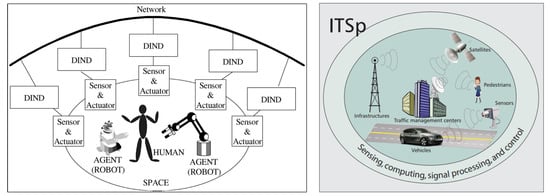 Conceptual figure of intelligent space and intelligent transportation space. The left figure shows intelligent space [51,55], in which the DIND means Distributed Intelligent Network Device; the right figure is the intelligent transportation space [54].