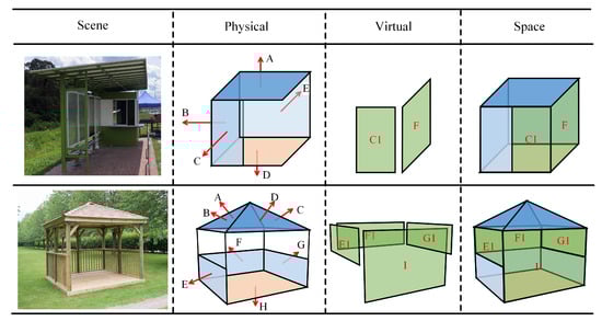 Reference [134] proposed an approach to extract 3D indoor spaces in complex building environments based on indoor space boundary calculation, which includes three steps: the Boolean difference for single-floor space extraction; relationship reconstruction; and cross-floor space extraction. In the research of semi-indoor (top-bounded) space [20] for navigation, the authors employed Top, Side, and Bottom to represent a top (e.g., roof, shelter), side (e.g., wall), and bottom (e.g., ground, floor) structure respectively to represent (imaginary or physical) boundaries for 3D spaces (Figure 9). They also proposed a projection-based approach to generate this kind of 3D space automatically. Currently, there is no research on semi-outdoor space modelling (generation).