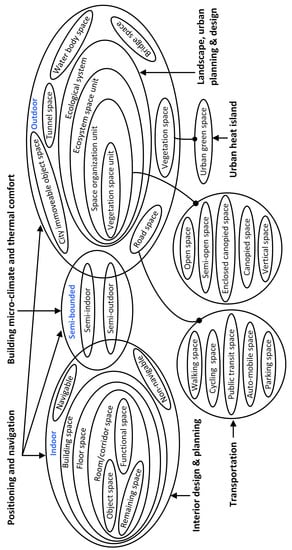 As seen in Figure 11, indoor, semi-bounded, and outdoor spaces are defined and employed as the basic carriers of all fields related spatial science and urban applications. Navigation and positioning covers all the three types of spaces. The semi-bounded spaces are mostly involved in building micro-climate and thermal comfort. The interior design and planning is focussed mostly on indoor environments and therefore indoor spaces are used. The research focusing on outdoor space is very extensive, even some types of space have become a subject of research by themselves. For instance, road space is a part of outdoor but, at the same time, it is the subject of the transportation. Outdoor vegetation space in urban area is generalized as green area, which is the protagonist of urban heat island. Landscape, urban planning and design mainly focus on spaces in outdoor.