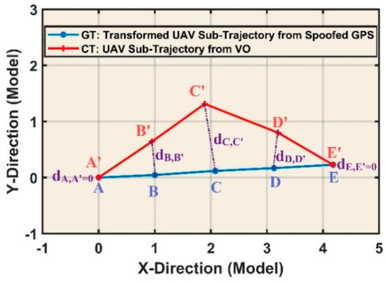 Figure 3 shows the Euclidian distances between the corresponding points of CTi and TGTi within a five-point window of Wi. In this figure, point C’ is the beginning point of UAV spoofing and its redirection point due to GPS spoofing which is recorded in CTi.