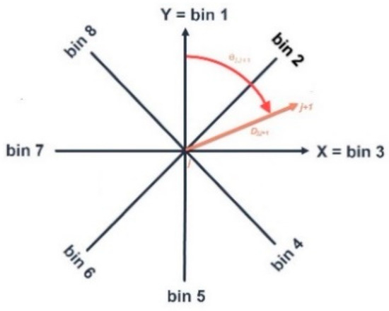 In conventional HOD, distance with the azimuth angle (the direction angle of concerning Y-axis) of (Equation (9)) is assigned to its nearest bin in terms of the angular distance, and then, the sum of the assigned distances to each bin is computed. In this paper, a modified HOD was constructed by dividing each distance of between its two nearest bins in terms of the relative angular distance of with the angles of those bins. In Equation (9), is the coordinates of the j-th point. The portion of each bin from each distance of is computed according to Equation (10). The two nearest bins of are determined using Equations (11) and (12):