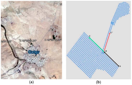 (a) A Google Earth view of Golgir village. (b) The flight lines of Golgir UAV photogrammetry project. The images and Global Positioning System (GPS) positions of these lines were used in the evaluation of the proposed method.