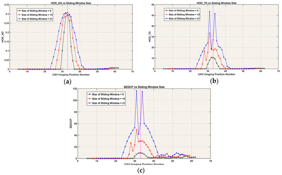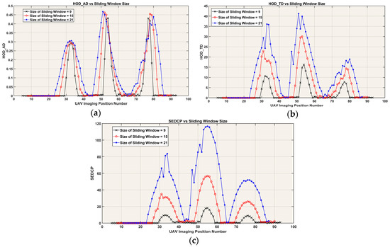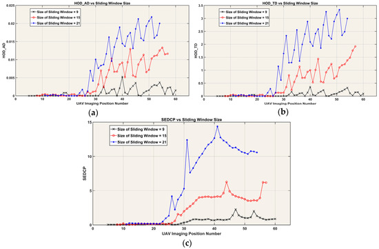 In Figure 10, the horizontal axis is the imaging position number of UAV in its flight trajectory and the vertical axis shows the values of the dissimilarity measure. In Figure 10a, when the imaging positions from VO are in coincidence with the GPS positions within the moving window, the HOD_AD is close to zero. In this scenario, this situation occurs up to the UAV imaging position number 26 for a window size of 15. Until this position, the moving window does not contain any fake GPS position from the line BC’. In this region, there is no significant difference between CTi and TGTi. However, by reaching the window to position number 27, and by entering the first fake GPS position (i.e., position number 34) into the window, the value of the HOD_AD dissimilarity measure begins to rise (Figure 10a). The maximum value of the HOD_AD dissimilarity measure has occurred at imaging position number 33, which is the starting point of UAV spoofing. As depicted in Figure 9, the maximum difference between CTi and TGTi has occurred at this point within the window W33. After passing position number 41, all imaging positions in the true-travelled spoofed UAV trajectory and all fake GPS positions in the predefined UAV trajectory are located in a straight direction within the moving windows (e.g., CT50 and GT50 at W50 in Figure 9). Therefore, HOD_AD becomes close to zero again, because, in these positions, TGTi coincides with CTi. This pattern can be observed in window sizes 9 and 21, as demonstrated in Figure 10a. Additionally, the results of this scenario from HOD_TD and SEDCP dissimilarity measures are presented in Figure 10b and Figure 10c, respectively. The results demonstrate that all HOD_AD, HOD_TD, and SEDCP have a good sensitivity to the instant change in the direction of UAV due to the spoofing. Additionally, the values of HOD_TD and SEDCP considerably increase as the window size increases from 9 to 15 and 21.