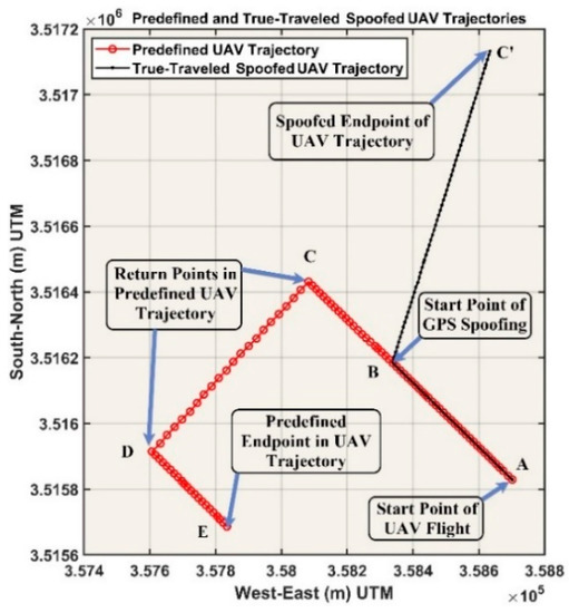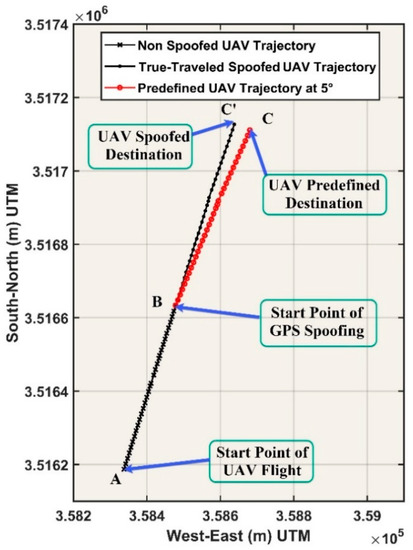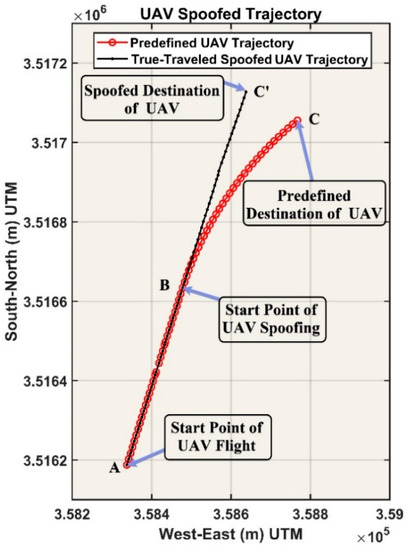 In Section 1, some studies about the successful spoofing of civilian UAVs using the GPS spoofing are reviewed [10,11,12,13,14]. In this paper, due to the limitations in the implementation of GPS spoofing, the occurrence of GPS spoofing in the SRB spoofing level was simulated. The UAV spoofing due to the GPS spoofing in the SRB spoofing level means that the spoofer knows the UAV location, destination, velocity, and its predefined trajectory. Thus, the spoofer can generate and propagate fake GPS signals so that the fake GPS positions generated from the spoofed signals coincide with the predefined UAV trajectory, while UAV is directed to another spoofed trajectory. The SRB spoofing level is the most difficult mode of GPS spoofing for detecting and mitigating. Additionally, it is assumed that the spoofer generates fake GPS signals so that the UAV velocity is not significantly changed. As a result, the distance travelled by UAV at the time of spoofing will be equal to its travelled distance in the case of that no GPS spoofing exists. This will make it almost impossible to detect the UAV spoofing using the comparison of UAV velocity and its travelled distance from the spoofed GPS and other sensors such as the camera.