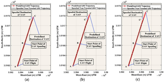 The fourth scenario of UAV spoofing. (a) The predefined velocity is 1.1 times of the spoofed velocity of UAV. (b) The predefined velocity is 1.2 times of the spoofed velocity of UAV. (c) The predefined velocity is 1.3 times of the spoofed velocity of UAV.