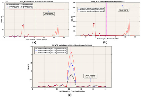 As can be seen in Figure 18, there was a maximum value almost at position number 31, which was the starting position of UAV spoofing. Concerning Figure 18a,b, HOD_AD and HOD_TD were sensitive to the redirection of UAV when UAV has deviated bigger than 2°. Additionally, SEDCP can detect deviations bigger than 1°. In this regard, the maximum values of HOD_AD and HOD_TD at 3° and the maximum value of SEDCP at 2° were selected as a reliable threshold for the spoofing declaration at each window. Therefore, the threshold values of HOD_AD, HOD_TD, and SEDCP were determined to be 0.002, 0.13, and 0.31, respectively. These thresholds were applied to the result of the scenarios in Table 3, Table 4, Table 5 and Table 6 to show the capability of the proposed method in the detection of UAV spoofing.