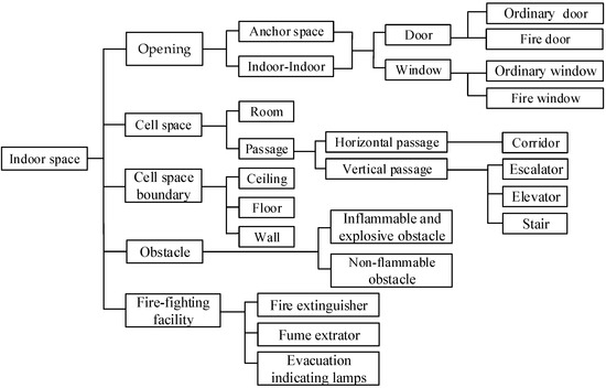 Traditional indoor models focus on the expression of indoor structure and routing under normal circumstances. However, some overlooked indoor components can play a key role in the case of fire emergency. There is presently no unified semantic description of indoor space for different applications. To meet indoor fire evacuation requirements, we therefore refer to IndoorGML [19] and add fire-related components to propose an extended indoor space description model for indoor fire scenarios. The indoor semantic structure description diagram of this model is shown in Figure 1.