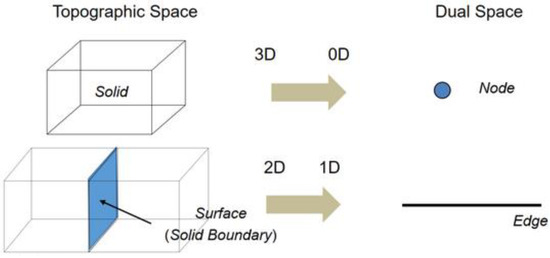 - Dual Space. Through the dual transformation, a k-dimensional object in N-dimensional space can be transformed into a (N-k) dimensional object in dual space. This means that in the corresponding dual space, a 3D cell space (e.g., room) is converted into a zero-dimensional node. A 2D boundary surface (e.g., wall and door) between two units is converted into a 1D edge. In this way, the original space is transformed into a node graph of dual space to express the topological relationship of the indoor road network. Figure 3 shows the example of dual transformation.