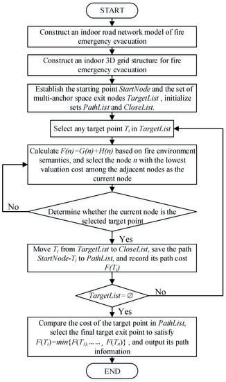 The essence of indoor optimal path planning is to find the path with the smallest cost between the starting and end points. Classic shortest route-planning algorithms mainly include those of Dijkstra [35,36], A* [37,38], Bellman-Ford [39], Floyd [40,41], and Shortest Path Faster Algorithm(SPFA) [42,43]. As a heuristic search method, A* can quickly respond to environmental information. It is an effective search method for solving the shortest path and is a commonly used heuristic algorithm for many routing applications. We therefore improve the A* algorithm and propose a 3D routing algorithm for indoor fire scenarios. The algorithm is transformed to solve the optimal routing problem with the least cost in an indoor navigation road network with multi-factor fire environment semantic constraints.