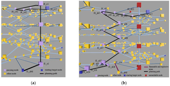 The semantic setting of the path accessibility environment of the fire scene is shown in Table 5. The ideal path planning situation in the simulation of all areas in scenario 1 is not on fire, and the obstacles in the path that hinder the passageway are as follows. In scenario 2, we simulated path planning when a fire occurs with obstacles. The experimental results are shown in Figure 9. The results of the indoor routing algorithm for the fire scenes are shown in black lines in Figure 9a in the absence of a fire in scenario 1. The sequence of nodes passed is f4_r17 → f4_w20 → f4_c43 → f4_c41 → f4_e1 → f3_e1 → f2_e1 → f1_e1 → f1_d46. In scenario 2, it was assumed that a fire occurs in the building, the door node f4_d22 in room A414 corresponding to f4_r17 is locked (red node in Figure 9b), and there are flammable and explosive objects from f1_c34 to f1_d46 (red section in Figure 9b). The results of the path planning in this case are shown as black lines in Figure 9b. The order of the nodes passed is f4_r17 → f4_d22 → f4_c42 → f4_c41 → f4_c40 → f4_d47 → f4_s07 → f3_s08 → f3_s07 → f2_s08 → f2_s07 → f1_s08 → f1_s07 → f1_d45 → f1_c33 → f1_d28 → f1_r16 → f1_w14. A comparison of the planned routes for scenarios 1 and 2 shows that when a fire does not occur, the elevator acts as a transit node and its state is reachable. At this time, the user can directly reach the first-floor exit via the elevator. Once a fire occurs, the elevator nodes are unreachable for safety concerns. Stairs are used as the vertical channel for evacuation. The planned path of the algorithm also effectively avoids unreachable nodes and flammable and explosive objects. This is because when there are unreachable nodes and flammable and explosive objects according to the indoor 3D navigation traffic cost function proposed in this paper. When planning the shortest path using the A* algorithm,