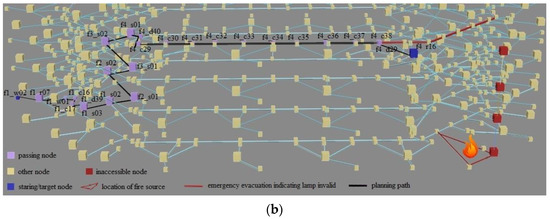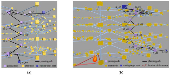 Impact of fire parameters on emergency evacuation routing. (a) Planning path in scenario 1; (b) Planning path in scenario 2.