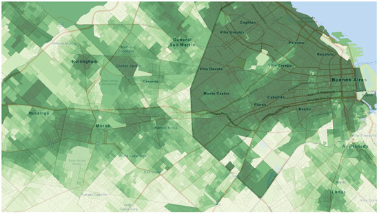 Figure 2 shows a region of Argentina with the LQI data overlayed as a choropleth map using a single-hue progression, where white areas have low LQI values, light green represents mid values and dark green have high values.