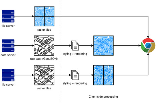 11] analyzed the impact of such technologies and their trade-offs for geoprocessing spatial data on the server or on the client side. The transmission of vector maps provides much flexibility compared to raster tiles, as the former are composed of multiple lines, and these lines can be simplified to save network bandwidth and improve performance. In this line, [