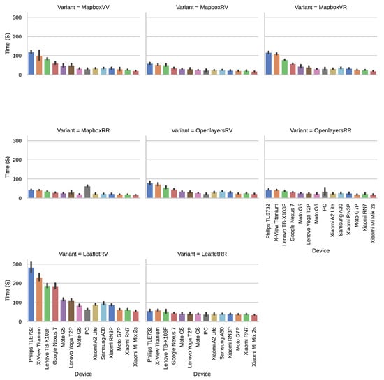The scatter plots show that, when aiming for network efficiency, vector maps are clearly the winners, with MapboxVV is followed closely by MapboxVR. In these cases, the savings in network bandwidth for using rich and complex but very compact vector based basemaps explain the results. Moreover, while these variants double the time required to finish the benchmark on low-end devices, on mid-end devices such as the Moto G6 or Xiaomi A2 Lite, they are just a bit slower than raster based variants. For high-end devices, both Mapbox GL JS and OpenLayers, either using raster or vector maps, have shown similar execution times, but the savings in network bandwidth make vector based variants are preferable. Finally, the two Leaflet variants have struggled to perform competitively, showing poor execution time and high network usage across all devices.