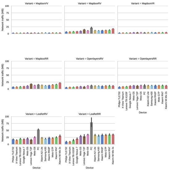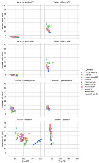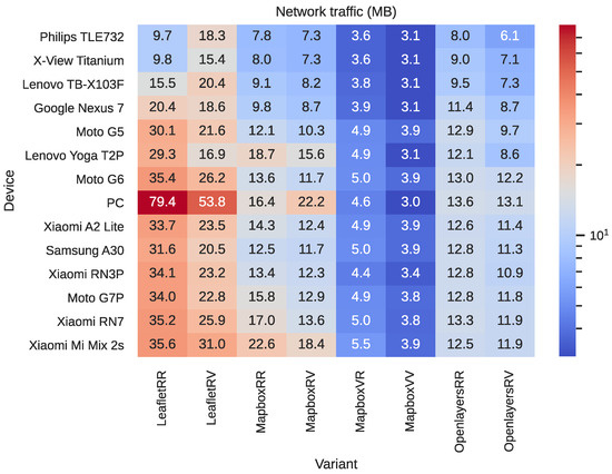 Figure 8 depicts a less detailed view of the same data, where blueish colors represent less network usage. We can observe that vector based implementations were the winners in terms of network efficiency, regardless of the devices. In particular, MapboxVV required significantly less network bandwidth than all the variants. In addition, more powerful devices tend to have bigger screens, so that variants using raster layers transferred more data. This explains the lower network usage of raster variants in low-end devices at the top of the figure. Leaflet used significantly more network bandwidth than the others on all devices. Again, Leaflet’s simple architecture and compatibility with all Web browsers impact negatively on efficiency.