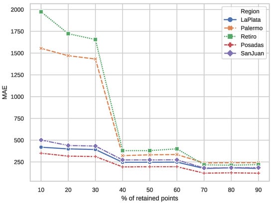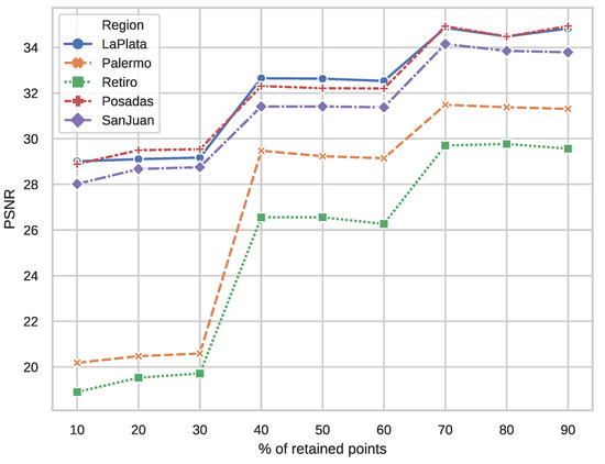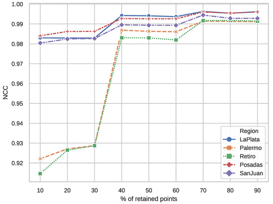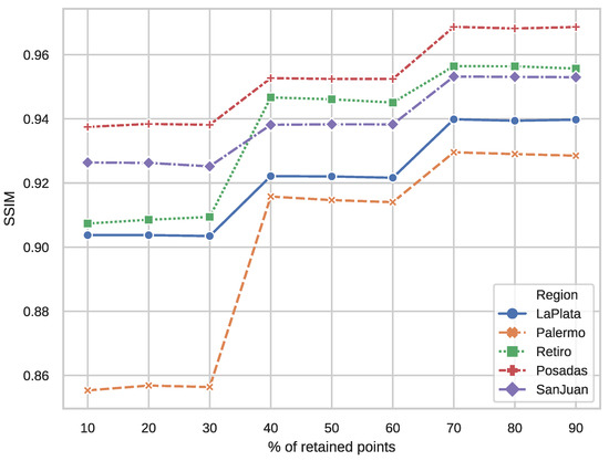 Figure 14 suggest that discarding more than 40% of the points degrades the map quality significantly, as measured by all the metrics. In addition, keeping more than 70% of the points makes almost no difference in quality, but the savings in space are significant because the compressed GeoJSON file has 100 MB versus 137 MB of the original version. On the other hand, even with a compressed LQI data file, the worse tiled variant (LeafletRR) requires a third of the network bandwidth (33 MB).