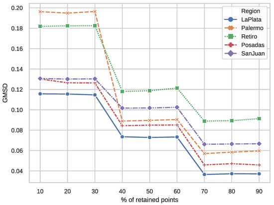 30]. This algorithm removes points with the least-perceptible change, which in practice means removing the vertex which together with its neighboring vertices form a triangle with the smallest area. We tuned it for preventing polygon features from disappearing. Furthermore, we did not merge adjacent polygons with different LQI values. We generated nine different GeoJSON files, retaining from 90% to 10% of the points of the original file. The resulting files sizes were from 126 MB to 35 MB, which are rather large for a typical mobile data connection. Then, we rendered the GeoJSON files as a map for five regions that have varied levels of details. All these regions contain a great number of polygons to properly assess the quality loss of applying the line simplification method.