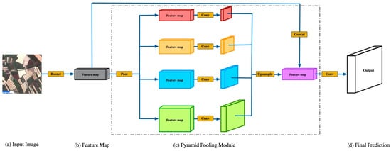 Our method can be used with any semantic segmentation model, such as U-Net, PSP-Net, etc. Taking PSP-Net as an example, its basic structure is shown in Figure 1 []. The input image (a) is fed into a Convolutional Neural Network (CNN) to obtain the feature map of the last convolutional layer (b). Then, a pyramid parsing module (c) is used to get different sub-region representations, followed by upsampling and concatenation layers to form the final feature representation. This contains both local and global context information. Finally, a convolutional layer is used to get the per-pixel prediction (d) according to the required representation.