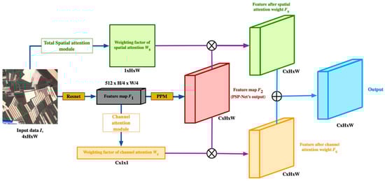 The general structure of DPA-PSP-Net is shown in Figure 2. We employed a pretrained ResNet50 [] and used a dilated strategy [] for the backbone. Drawing upon the structure of ResNet50, the proposed framework has four residual blocks, a Pyramid Pooling Module (PPM), a channel attention module, and a spatial attention module. We removed the down-sampling operation and employed dilated convolutions in the last two residual blocks instead, which is identical to the process used in PSP-Net. Thus, the size of the final feature map was at 1/8 of the scale of the input image. Given an input image with a size of 256 px × 256 px, we used ResNet50 to get the feature map, F1, while the weighting factor for the spatial attention, Ws, was obtained by the spatial attention module. F1 was fed into the PPM and the channel attention module, respectively, to obtain the feature map, F2, after up-sampling and applying the weighting factor for channel attention, Wc. Finally, F2 was multiplied by Wc and Ws to obtain the features to obtain the channel attention-weighted feature map, FC, and spatial attention-weighted feature map, FS. Then, FC and FS were aggregated to get the final output.