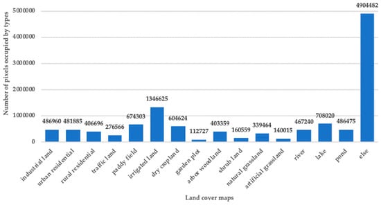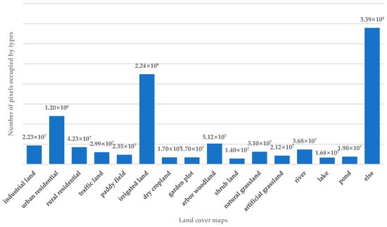 The high-resolution image dataset, GID [], is a large-scale land cover dataset. It was constructed from GF-2 satellite images. As a result of its large coverage, wide distribution, and high spatial resolution, it has a number of advantages over existing land cover datasets. GF-2 is the highest resolution civil terrestrial observation satellite in China at present, so the image clarity of the dataset is exceptional. The categories covered by the dataset are also both varied and typical, so the characterization of the land cover types is representative of the distribution of the land cover in most parts of China. At the same time, the complexity of the land cover types make the dataset especially valuable for research. The GID dataset consists of two parts: a large-scale classification set and a fine-grained land cover classification set. The large-scale classification set contains 150 GF-2 images annotated at pixel level. The fine-grained classification set consists of 30,000 multi-scale image blocks and 10 pixel level annotated GF-2 images. We deliberately chose to use the GID dataset with 16 kinds of land cover, which are more difficult to train. Each image is 6800 px × 7200 px, with 4 NirRGB channels and high-quality pixel-level labels for the 16 types of land cover. The 16 types of land cover are as follows: industrial land; urban residential; rural residential; traffic land; paddy field; irrigated land; dry cropland; garden plot; arbor woodland; shrub land; natural grassland; artificial grassland; river; lake; pond; and other categories. Figure 4 shows the distribution of the types of land cover.