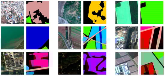 After removing the validation set from the GID dataset, 15,000 images were randomly cropped from the original images to 256 px × 256 px to create a training set. As there was an uneven distribution of different types of land cover, we cropped images with the lowest GID land cover distribution, such as garden plots and artificial grassland from the original images, giving about nine images of different sizes. Then, 1000 256 px × 256 px images were randomly cropped from these nine images and added to the training set to improve the distribution. Thus, the final training set was made up of 16,000 images with a size of 256 px × 256 px, as shown in Figure 6. Figure 7 shows the training set’s distribution. We did not use a test set, as the size of the dataset was too small. Although there are 16,000 images in the training dataset, they are randomly cropped from the rest of the GID dataset. Therefore, there is an overlap between the pictures of the training set. This operation itself is a data enhancement process and would be difficult to train because it would take up too much memory.