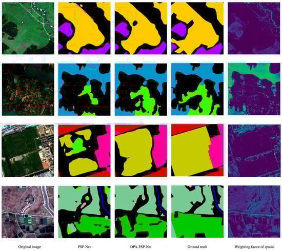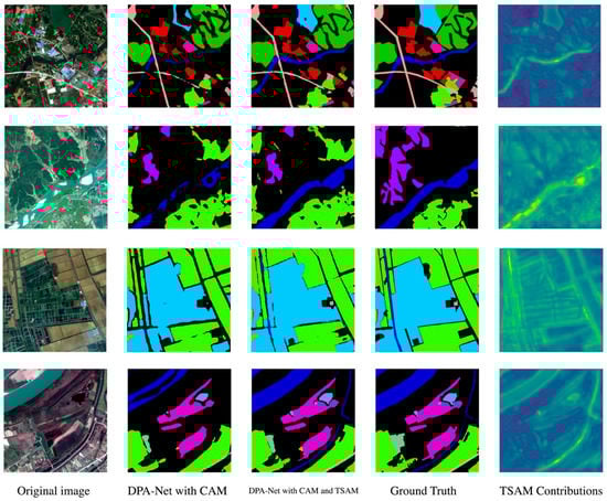 The output of TSAM is shown in the rightmost column in Figure 9. Although the input of TSAM is the original image, the output does not seem to include a lot of noise. For some position attention modules, such as “lake” in the second row and “dry cropland” in the last row, the details and boundaries are even more clear. These results reveal the effectiveness of the visualized weighting factors of TSAM.