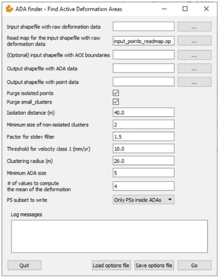 This application, based on the methodology explained in [26], is used to identify the main areas where a displacement has been measured by the PSI processing, squeezing the information contained in the input deformation map and assessing the quality of the time series information (i.e., spatial-temporal noise) of each ADA. Additionally, ADAfinder includes the option to filter the input displacement map from the isolated or potential outlier PS. We refer to [26] for more details on the quality assessment and the outlier filtering methods. This tool allows the amount of data to be managed in terms of both hardware space and computational time to be reduced.