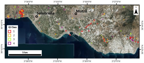 An example of the output of ADAfinder in the coastal area of Granada (S Spain). Colors are used to show the quality of the time series (TS) information according to the quality index attribute in the output shapefile. Red: “very reliable”, orange: “reliable”, lime-green: “not so reliable” and purple: “not reliable”.