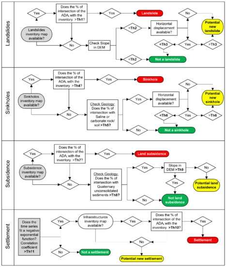 Up to six different kinds of deformation phenomena are detected. The ones analyzed by ADAclassifier are landslides, sinkholes, land subsidence, and constructive or consolidation settlements. THEXfinder takes care of the identification of deformation processes due to expansive soils and temperature effects. A different algorithm (or sub-methodology) has been devised for each of these. Figure 3 depicts the workflow of the algorithms implemented by ADAclassifier to detect the four aforementioned phenomena.