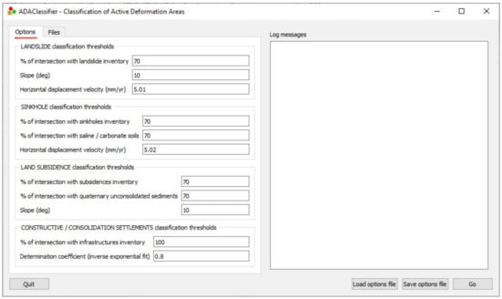 Note that, especially in the case of the so-called classification tools (ADAclassifier and THEXfinder), the ability of these applications to work with a big number of optional inputs (i.e., inventories of several kinds) leads to a high degree of flexibility, making the tools useful in a wide variety of situations that are usual in real-life production environments. In other words, ADAclassifier can deliver results for just one deformation phenomenon or go up to four of these, depending on how many optional inputs are provided. The flexibility of the ADAclassifier is displayed in the two use cases (see Section 7.1 and Section 7.2), where the availability of input data for the classification process was completely different. The situation in the Spanish use case (Section 7.1), where only a few ancillary data are available, is unfortunately more usual than that of the Italian case (Section 7.2), for which a noticeable number of data sources were available. The fact to note here is that ADAclassifier (and THEXfinder) is (are) able to deal with these two extreme situations.