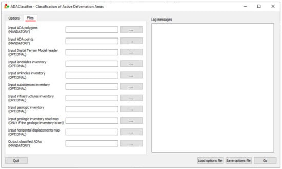 Figure 4 and Figure 5 depict the GUI of the ADAclassifier tool; the first one shows the options tab where the set of thresholds controlling the application are set; in the second one the list of (mostly optional) files may be appreciated.