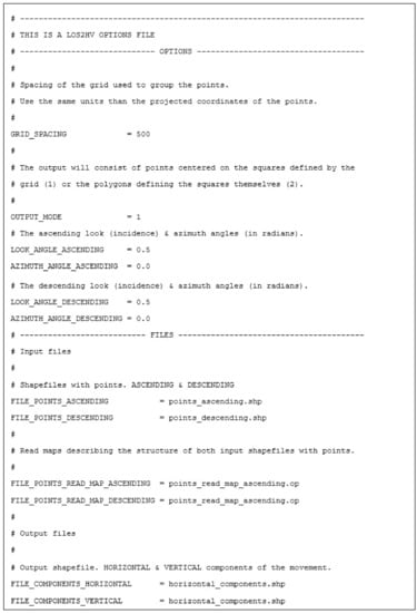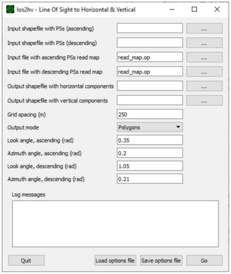 The tool accepts (input) and produces (output) ESRI shapefiles for compatibility reasons. On output, los2hv creates two files, to store, respectively, the East-West horizontal and vertical components of the movement as observed along the LOS. It should be clarified that North–South displacements are not calculated since, due to the nearly North–South orbit direction of SAR satellites, InSAR is insensitive to this displacement component [35]. It is noteworthy that this limitation is associated with the InSAR information itself instead of the los2hv tool.