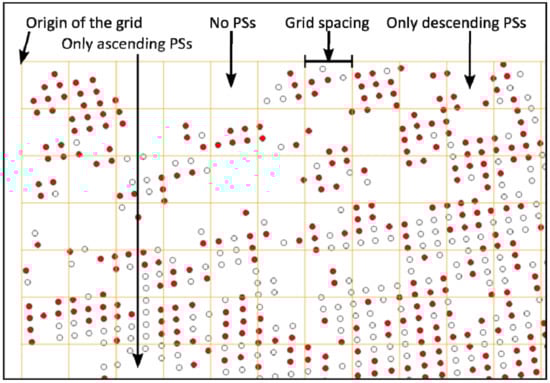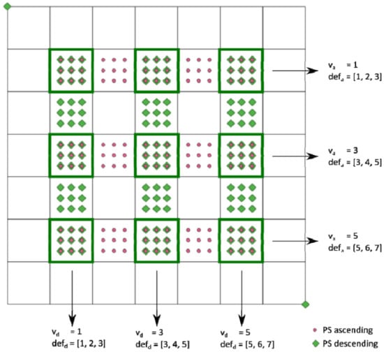 There may be tesserae where: (1) there are no PS; (2) there are only PS from the ascending input file; (3) there are only PS from the descending input file; and finally (4) there are PS from both input files (see Figure 9). For those tesserae of type (4), the ground movement is averaged using the values of all the PS included in the tile. The resulting amount, measured along the LOS, is then converted to East-West horizontal and vertical components according to the formulae described in [36]. The value of the East-West horizontal and vertical components of the ground movement corresponds now to the whole area covered by the tile where the points involved in the computation where located.