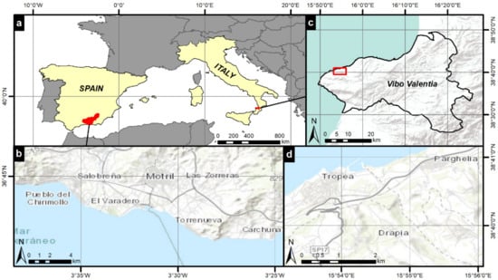 (a) Location of the real test cases in the province of Granada (Spain) and Vibo Valentia (Calabria, Italy); (b) Detail of the test area located in the Granada coast. (c) Test site of Vibo Valentia; and (d) Detail of the test area of Vibo Valentia.