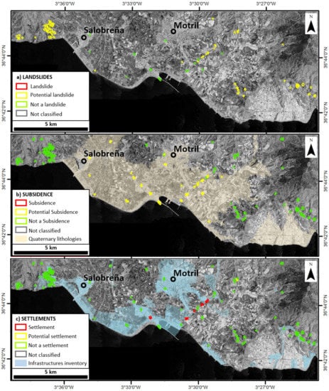 Concerning the real use cases, the results obtained illustrate the applicability of the tools developed to automatically and successfully identify and classify the geological and geotechnical processes affecting wide areas of the territory. Landslides, potential landslides, consolidation settlements, and potential land subsidence have been identified in both test sites using inputs with different characteristics (i.e., InSAR and DTM resolutions, inventory maps, and land use maps). Thus, the possibility of using different input data reveal a high versatility of the proposed tools. Furthermore, this methodology has the advantage that results can be periodically updated by incorporating new InSAR datasets and updated ancillary information.