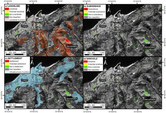 Classification of active deformation areas (ADA) in the study area of Tropea-Zaccanopoli as: (a) landslides; (b) subsidence; (c) consolidation settlements; and (d) sinkholes.