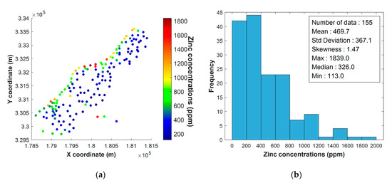 Information about Meuse dataset: (a) a spatial distribution of zinc concentrations and (b) a histogram with basic statistics.