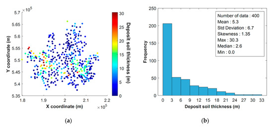 Information about the Seoul borehole dataset: (a) a spatial distribution of the deposit soil thickness and (b) a histogram with basic statistics.