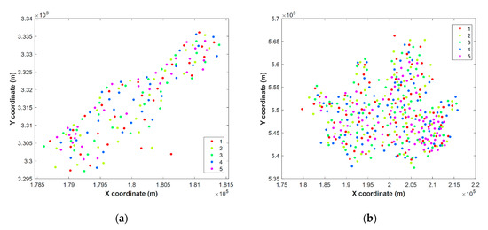 Results of dividing sample data into five folds considering unbiased spatial distribution for (a) Meuse and (b) Seoul borehole datasets.